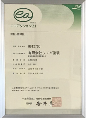 また平成30年4月にはエコアクション21を取得し、環境面にも力を入れ、クリーンな塗装会社を目指しています。